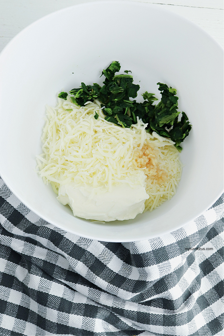 - Make the Filling:In a large bowl, combine the squeezed spinach with the cream cheese, shredded mozzarella, grated Parmesan, salt, and pepper. Stir until everything is creamy and well mixed—your delicious cheesy filling is ready!
