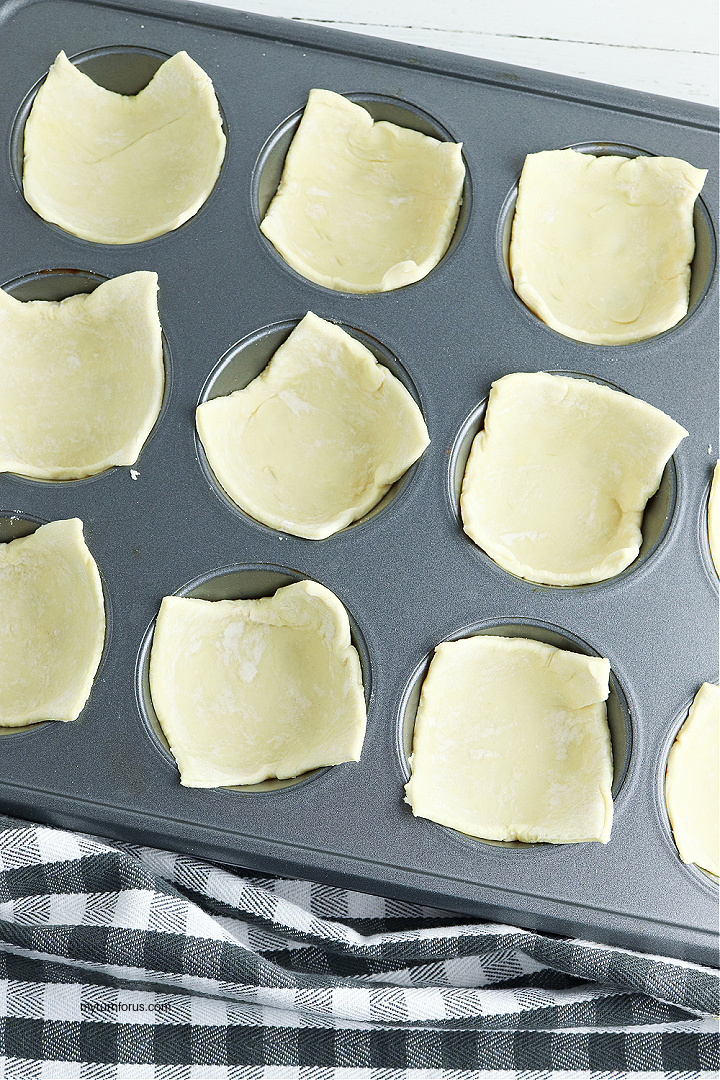 - Gently press one puff pastry rectangle into each muffin cup, letting the corners drape over the edges a bit—these will become the pretty, flaky tops!