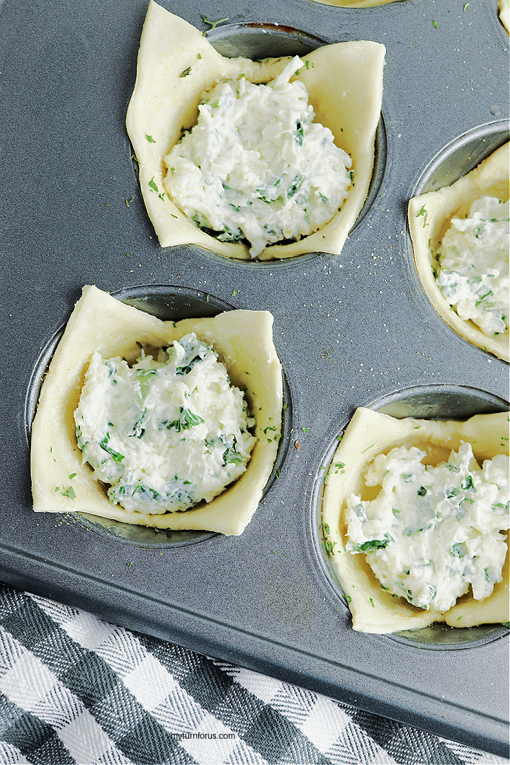 - Spoon the spinach-cheese filling into each pastry-lined muffin cup, filling them about halfway (don’t overfill—the pastry needs room to puff!)