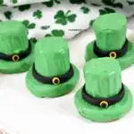 Try our easy instructions to make Leprechaun Hats cookies. These easy St Patrick’s day cookies double as a fun craft and a delicious treat. You can make the cutest St Patty’s day cookies hats with purchased cookies and melted chocolate and just a couple of tricks. Fun St Patricks day snacks for kids.