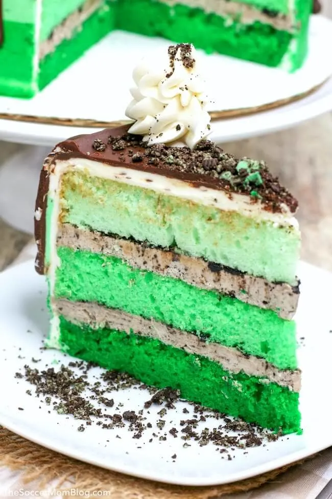 Is this Amazing? Green Cake layered between mint oreo frosting topped with vanilla frosting and drizzled with a chocolate ganache. It’s the pot of gold at the end rainbow good when it comes to St Patrick’s Day Desserts.