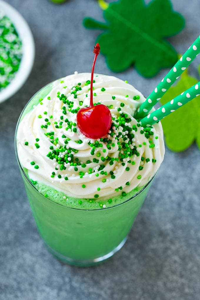 Whip up a green shake to celebrate the day! Loaded with mint flavor and topped with whipped topping and sprinkles makes this one of the easiest St Patrick’s Day Desserts!