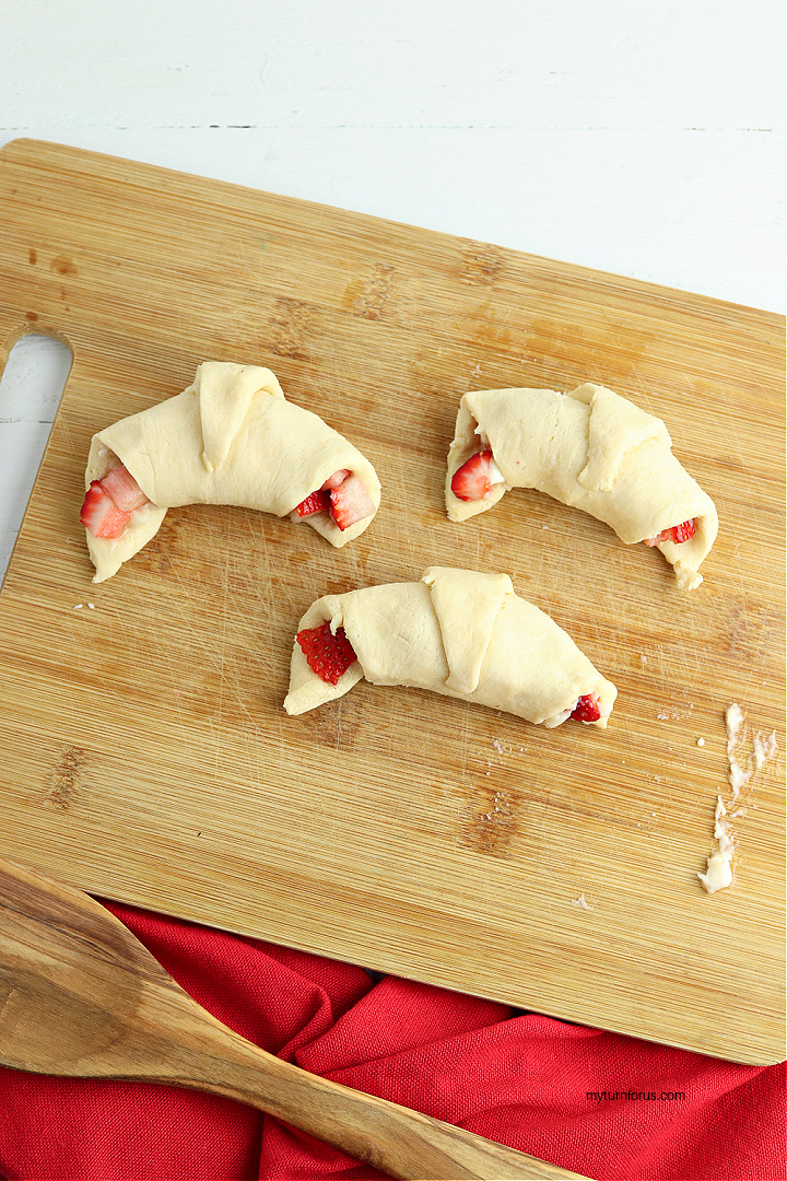 Roll up each triangle around the strawberries and cream cheese starting from the wide end making a filled croissant.