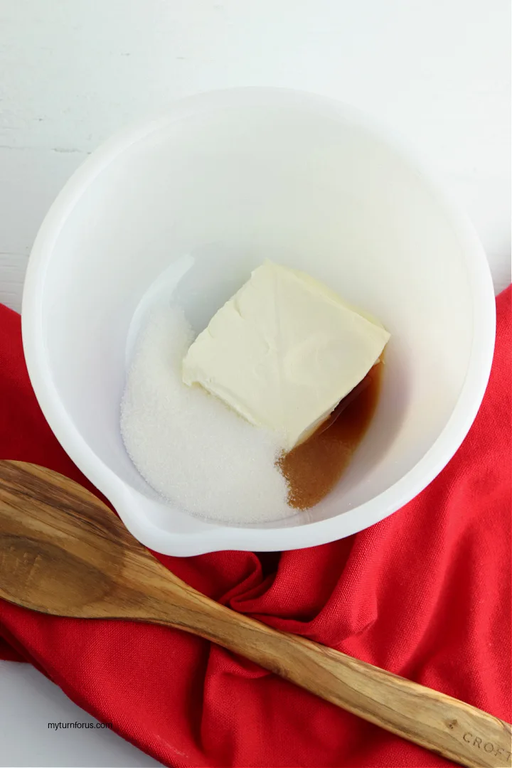 • Preheat your oven to 350° F and line a baking sheet with parchment paper. In small bowl, beat together the cream cheese, vanilla, and ¼ cup sugar until smooth using a hand mixer if needed.