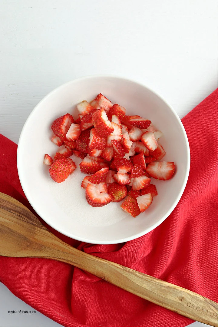 • In a separate small bowl, stir together the diced strawberries and 1 tablespoon sugar.