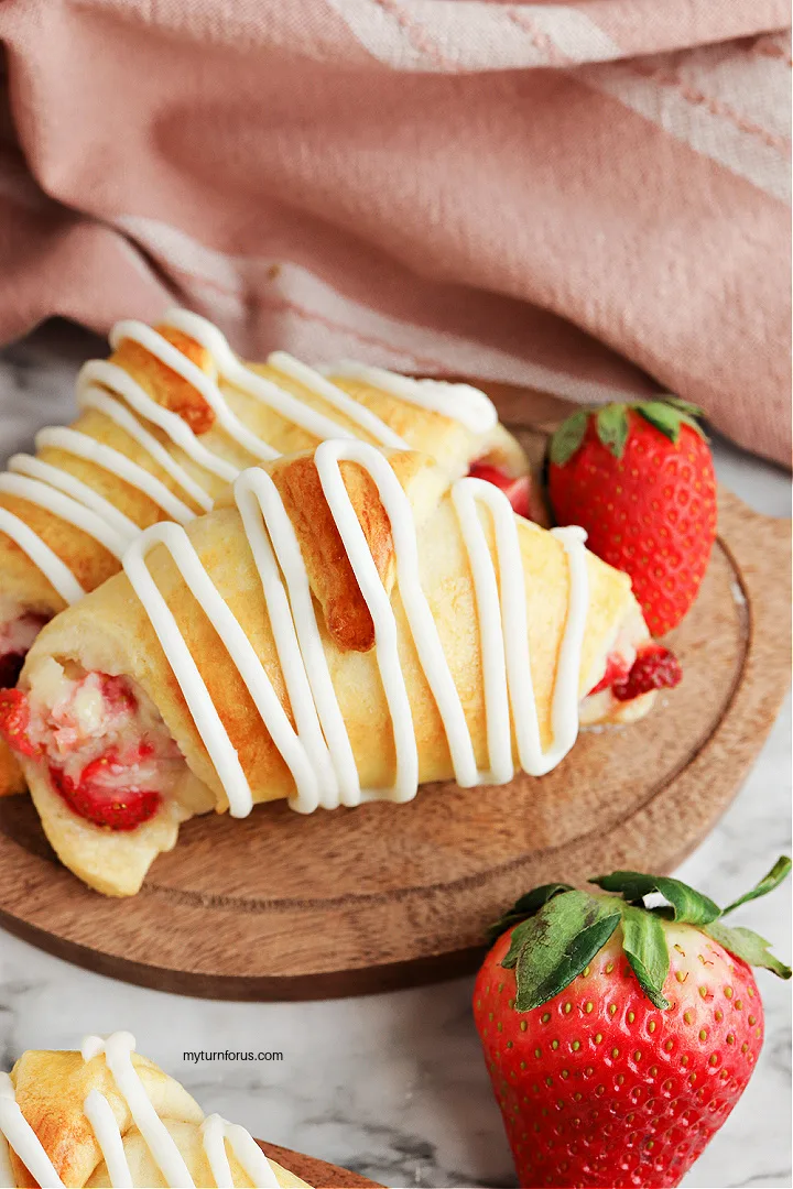 This Strawberry filled croissants recipe makes eight Strawberry Cheesecake Crescent Rolls with topped with a homemade glaze. Strawberry Cream Cheese Crescent Rolls can either be served as a dessert or as a breakfast pastry.