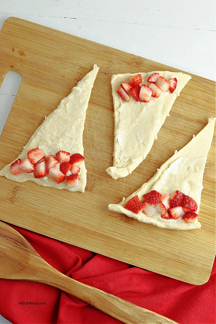 • Roll up each triangle around the strawberries and cream cheese starting from the wide end.