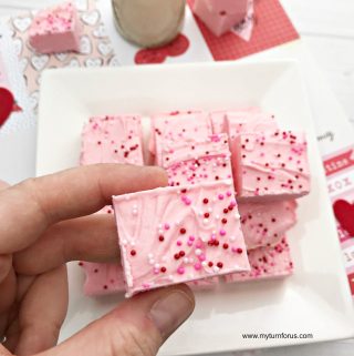 A Valentine's Day Fudge recipe that makes a pink strawberry fudge with sprinkles