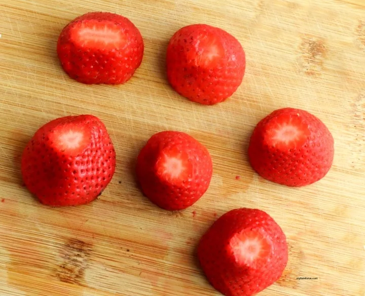 - Wash the strawberries, pat them dry, then remove the green leaves and slice off a tiny bit of the pointed bottom tip from each one.