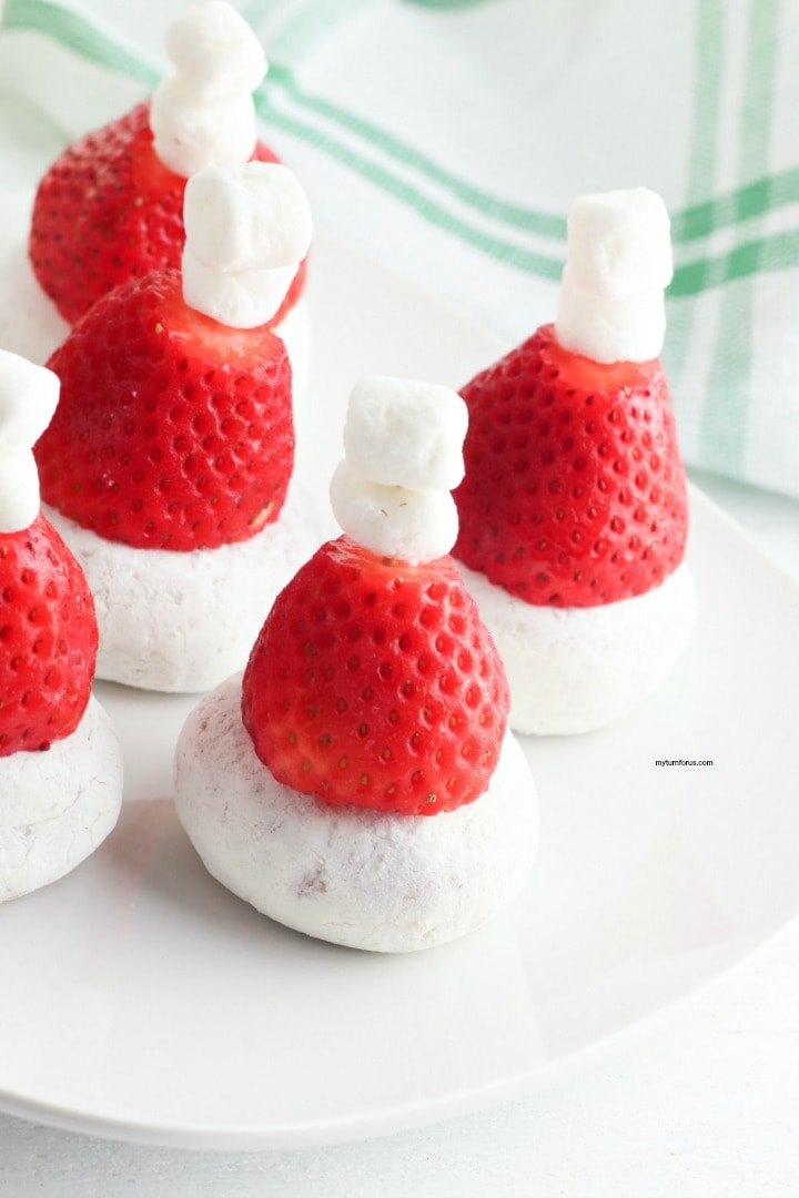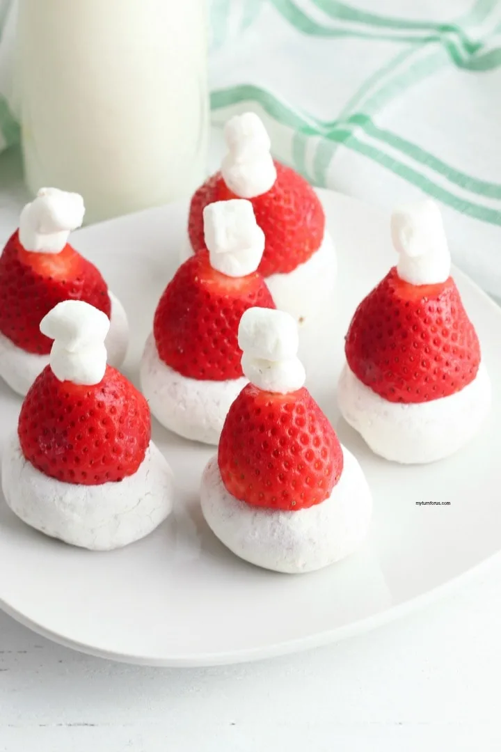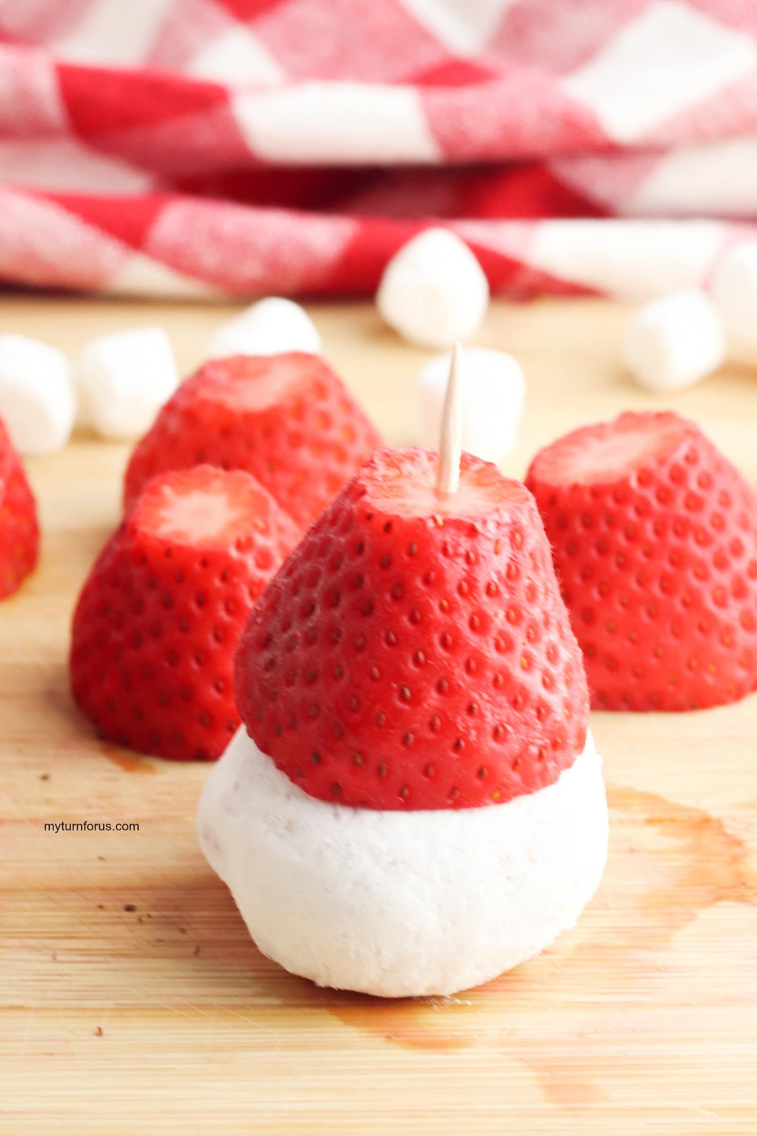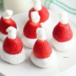 These sweet little Christmas treats are as much fun to make as to eat. And just about everything can be assembled by kids if an adult slices the tips off of the strawberries. You could also change it up and add whipped cream on top to make the fluffy pom pom instead of the mini marshmallows. And you could serve them with a chocolate sauce to either dip them in or drizzle over them?