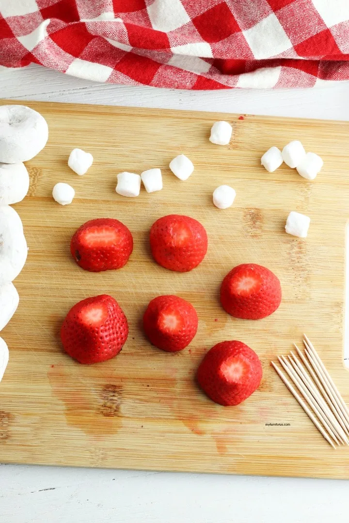 - Top each mini donut with one strawberry (repeat until all 12 donuts are crowned with a strawberry).