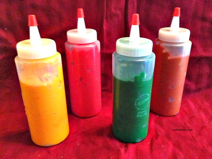 - This makes for a good amount of icing. I divided the icing into separate bowls, one for each color I was going to be using and mixed in the gel food coloring of the colors I wanted. I then placed each color into a plastic squeeze bottle to allow for easy tracing of the decoration designs.