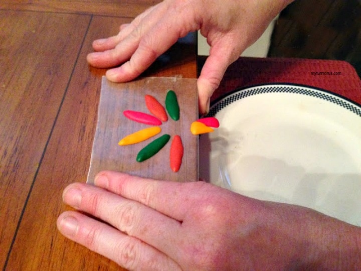 - Once I had iced the Thanksgiving turkey cookies with the brown powdered sugar icing, I then removed the royal icing decorations from the wax paper and arranged them on these turkey sugar cookies. You want to be very gentle removing these from the wax paper to prevent them from breaking or cracking. Either use a toothpick to gently prod the icing decorations off the wax paper, or place the wax paper on the edge of the counter or table and roll it down over the edge. This will easily dislodge the pieces.