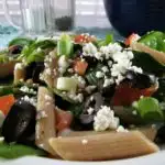 This penne pasta salad with spinach is the main dish in itself.  It’s loaded with penne, fresh veggies, feta cheese and topped with a homemade vinaigrette dressing.