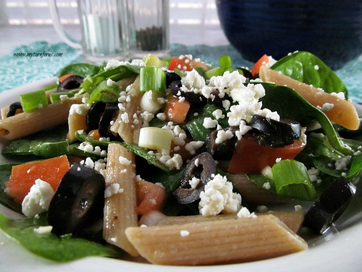 Make your Mediterranean spinach salad with whole grain penne pasta, ripe olives, fresh tomatoes, fresh spinach, and feta.   Then top it with a homemade easy spinach salad dressing below.