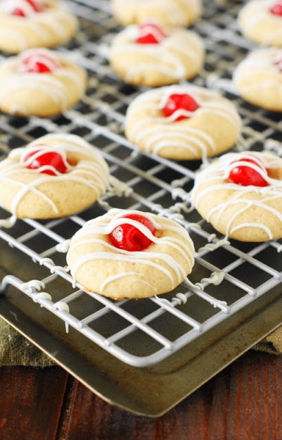 White chocolate drizzled over the maraschino cherries topped almond cookies! Drooling!