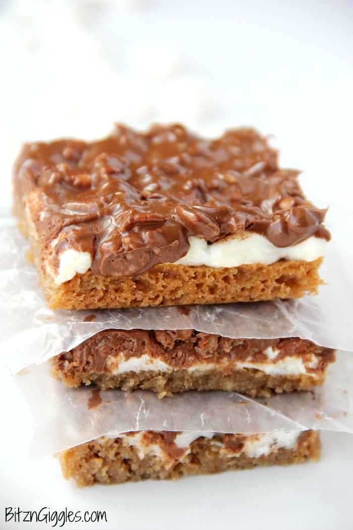A Scrumptious Christmas bar that has a cake-like crust with a marshmallow center and chocolate peanut butter krispie topping!