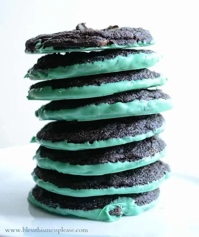 A classic chocolate cookie dough recipe with chopped Andes Mints and then dipped the bottom of the cookie in melted mint chips!