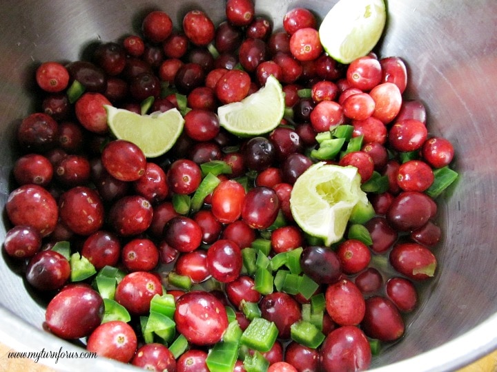 - Add cranberries, jalapeños, limes with their juice, apple cider vinegar, and water in a medium saucepan bring to a boil