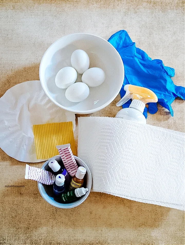 boiled eggs, food coloring, coffee filter, water spray bottle