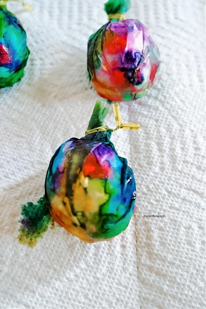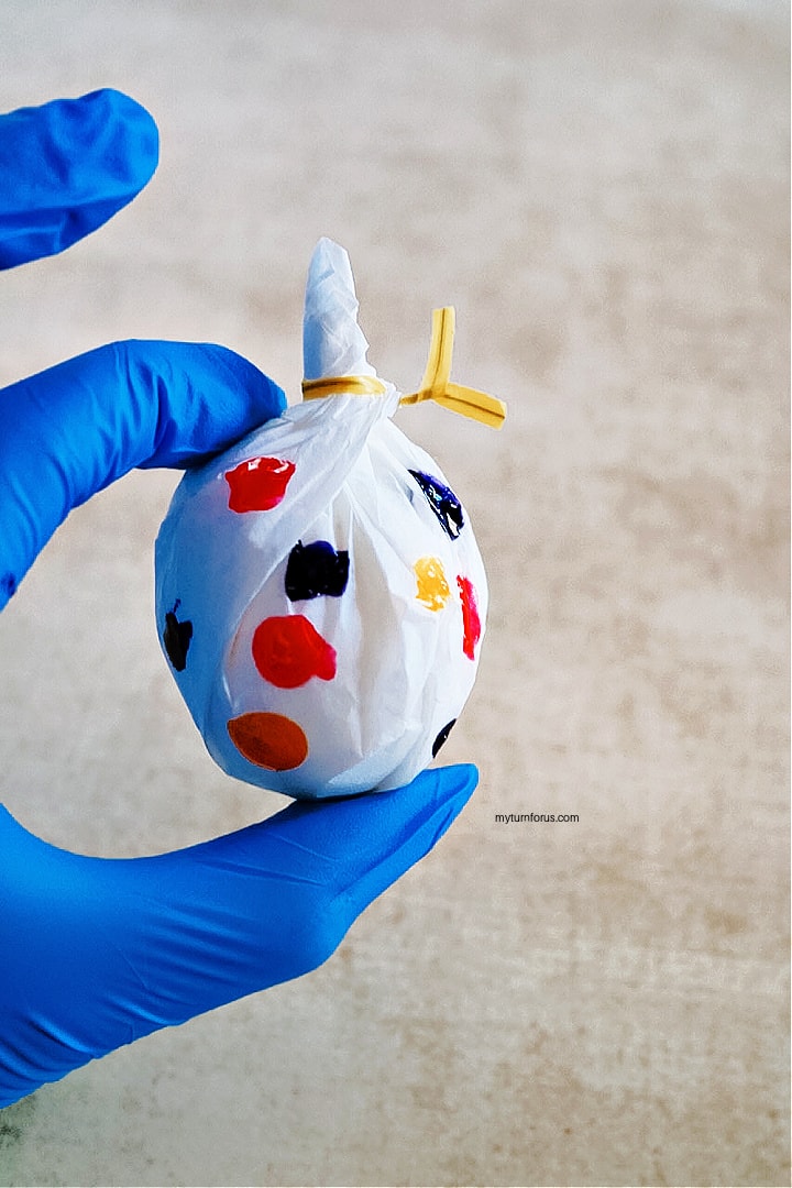 • Place drops of food coloring directly on your wrapped eggs. Be sure to leave white spaces as well. Continue until the filters are covered with spots.