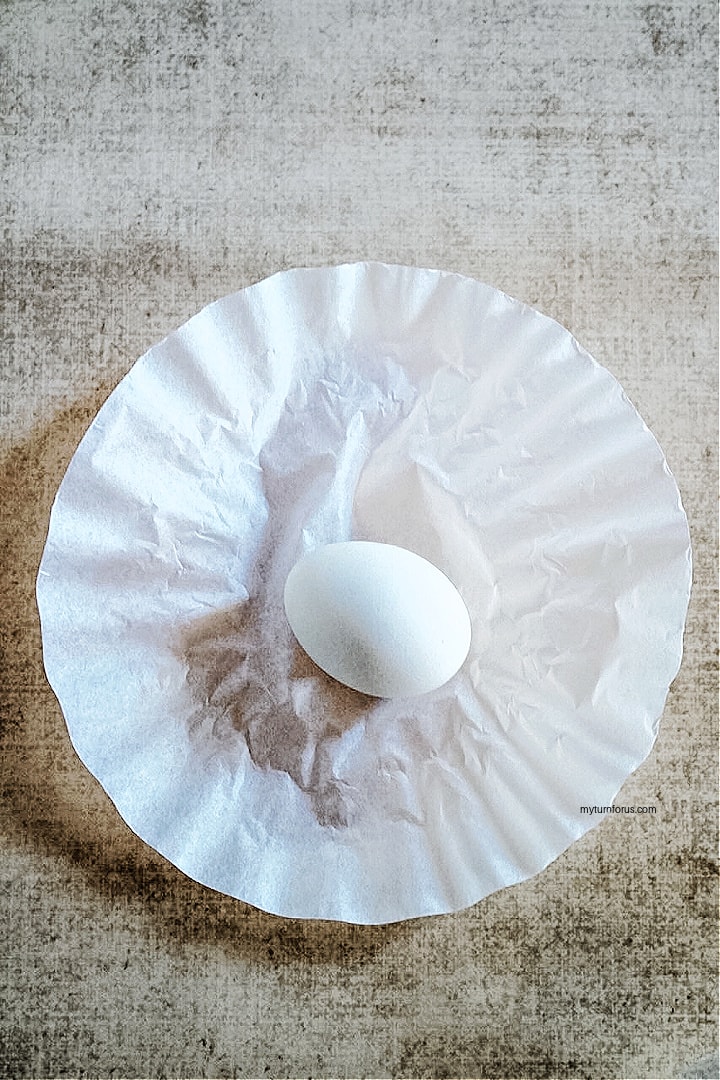 Make sure you are starting with dry, hard boiled eggs that you have cooled completely.  Place one of your eggs in the center of a paper coffee filter.
