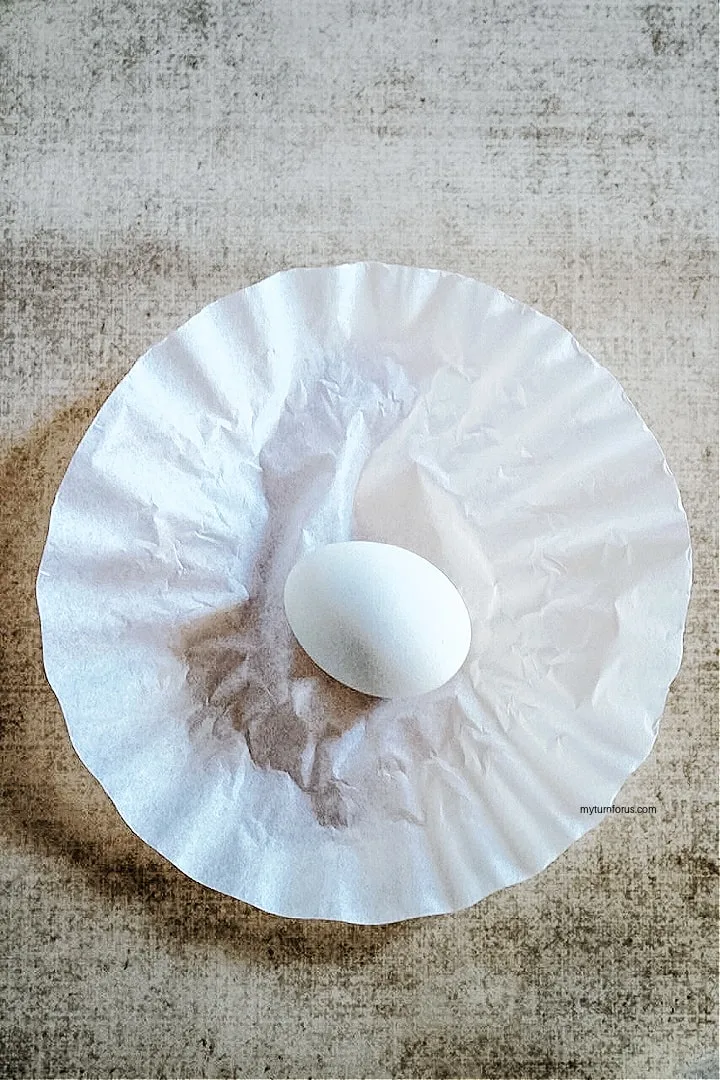 • Make sure you are starting with dry, hard boiled eggs that you have cooled completely. Place one of your eggs in the center of a paper coffee filter.