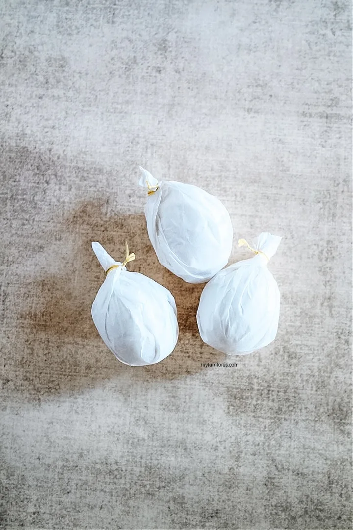 • Fold the coffee filter up around the egg and use your twist tie to close. Wrap the rest of your eggs in coffee filters and tie.