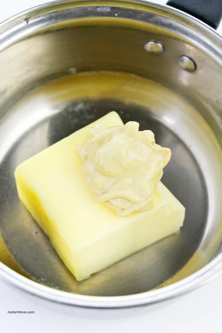 • In a small saucepan, melt the butter and dijon mustard over medium-high heat. And whisk as the butter melts to emulsify them together to create a spread for your turkey and cheese sliders.