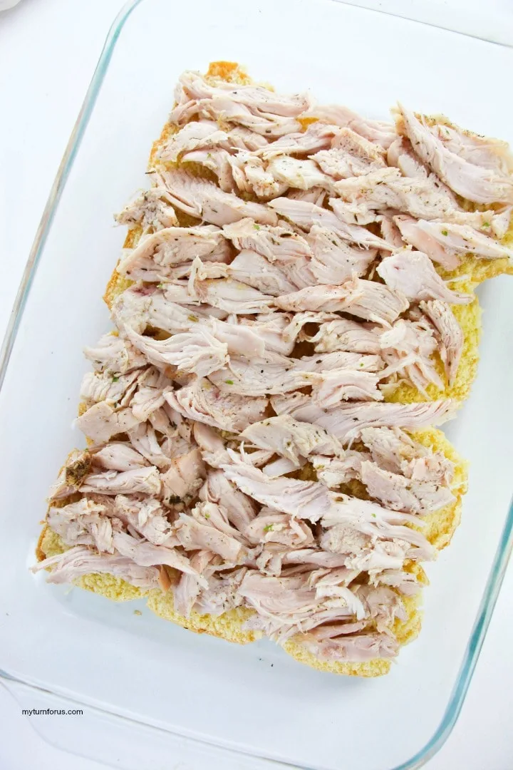 • Evenly layer your shredded leftover turkey on top of the rolls in the casserole dish.