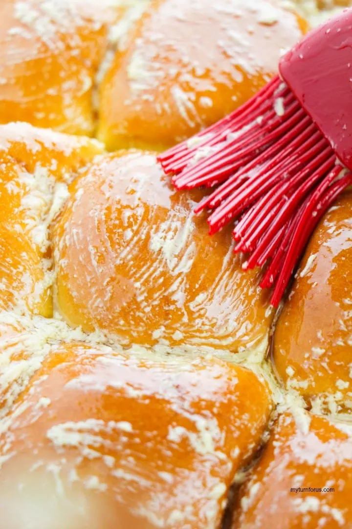 Place the bread tops over the turkey and Swiss cheese.   Then pour your butter/dijon spread over the bread tops and use a pastry brush to coat them all evenly.