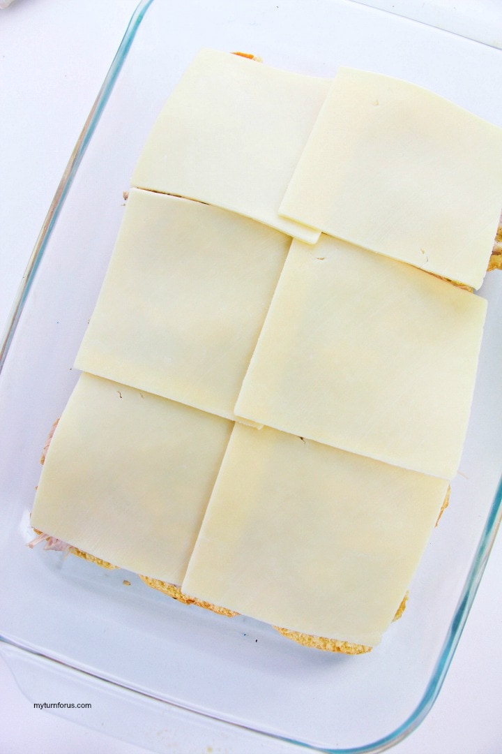 Then layer your Swiss cheese slices on top of the leftover shredded turkey.