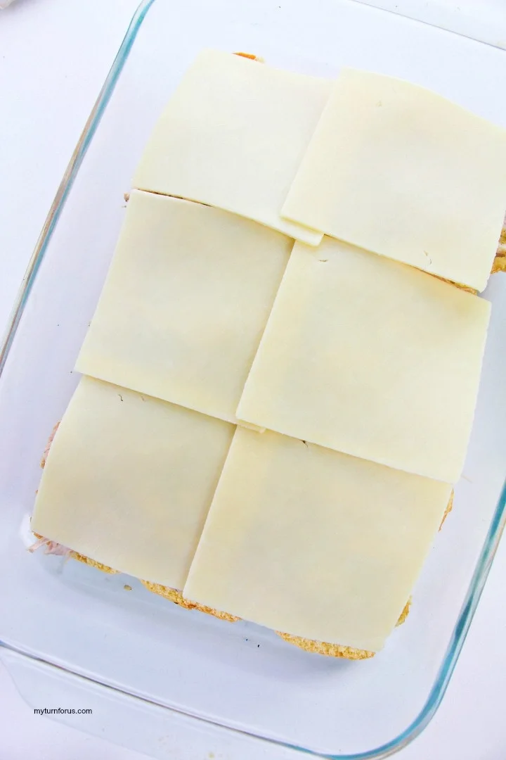 • Remove from oven and use a knife to slice into separate sliders. And carefully lift each turkey and cheese slider out of the pan using a spatula and place on a serving plate.