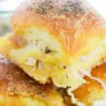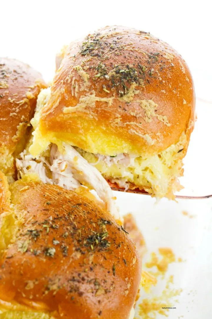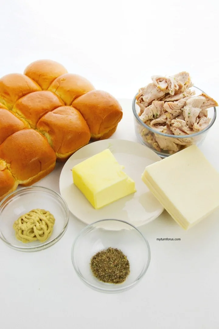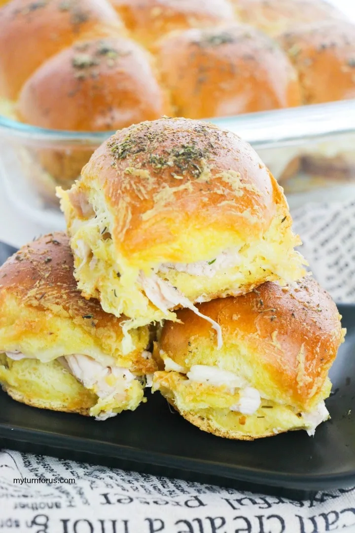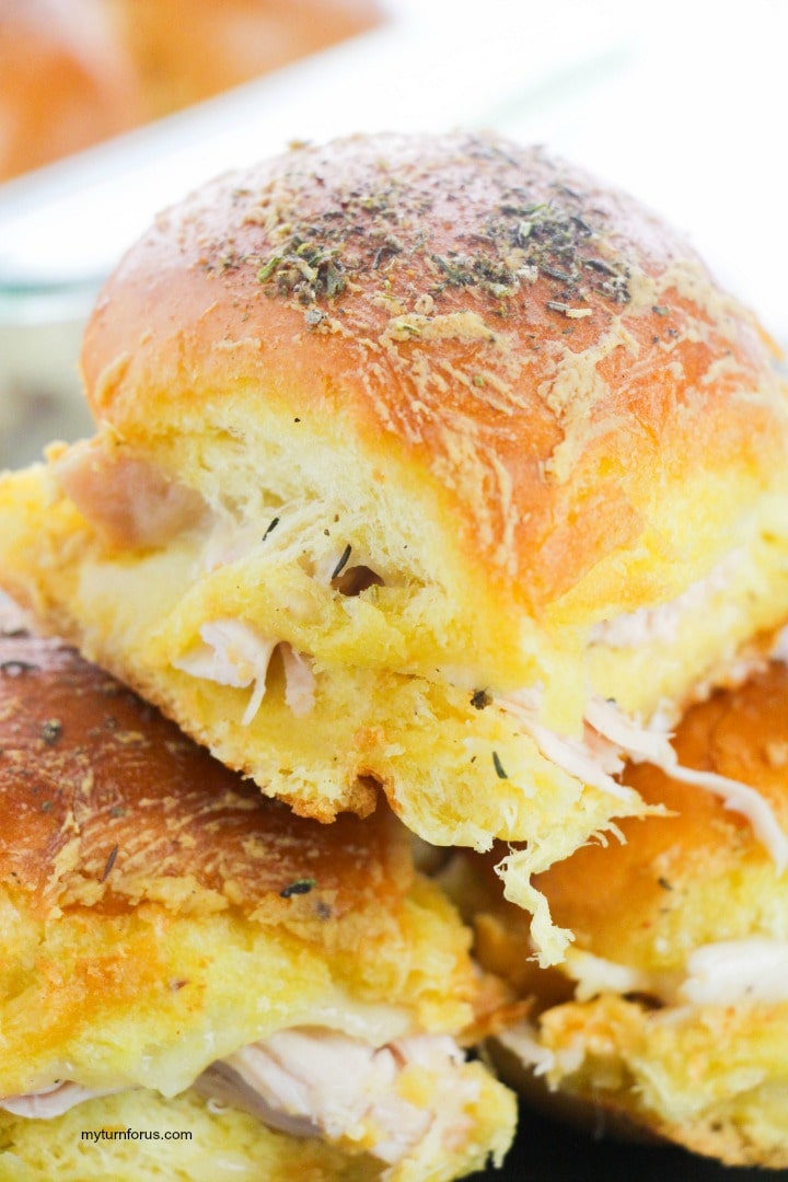 Use a 12 pack of dinner rolls.   Cut the rolls and fill them with plenty of turkey and slices of cheese.  And then top these baked turkey and cheese sandwiches with a butter/dijon mustard mixture and add a sprinkle of poultry seasoning.   After you assemble these leftover turkey sliders, you bake them in your oven to melt that creamy Swiss cheese. The combo of these flavors is just amazingly delish!