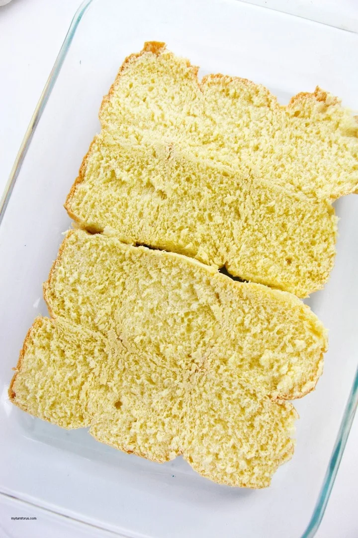 • Cut the sheet of sandwich bread rolls in half through the middle. And lay the bottom half of the sandwich bread in the casserole dish and set the top halves aside.