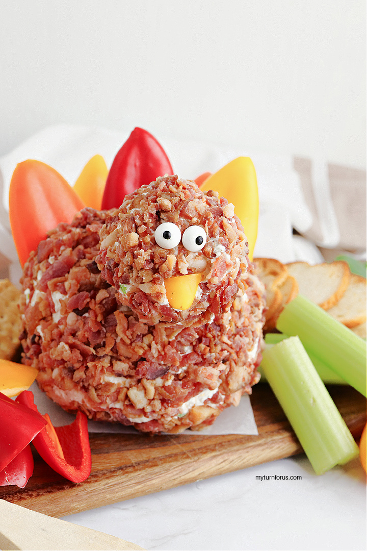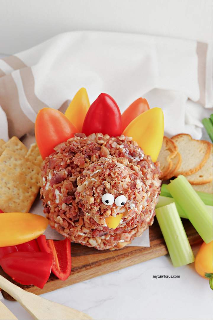 Are you looking for the perfect appetizer to impress your Thanksgiving guests? Look no further than this savory and scrumptious turkey cheese ball. This classic dish combines the flavors of Thanksgiving with the indulgence of a creamy cheese ball, making it the ultimate crowd-pleaser. This fun turkey shaped appetizer cheeseball for Thanksgiving is coated with bacon and adored with colorful bell peppers.