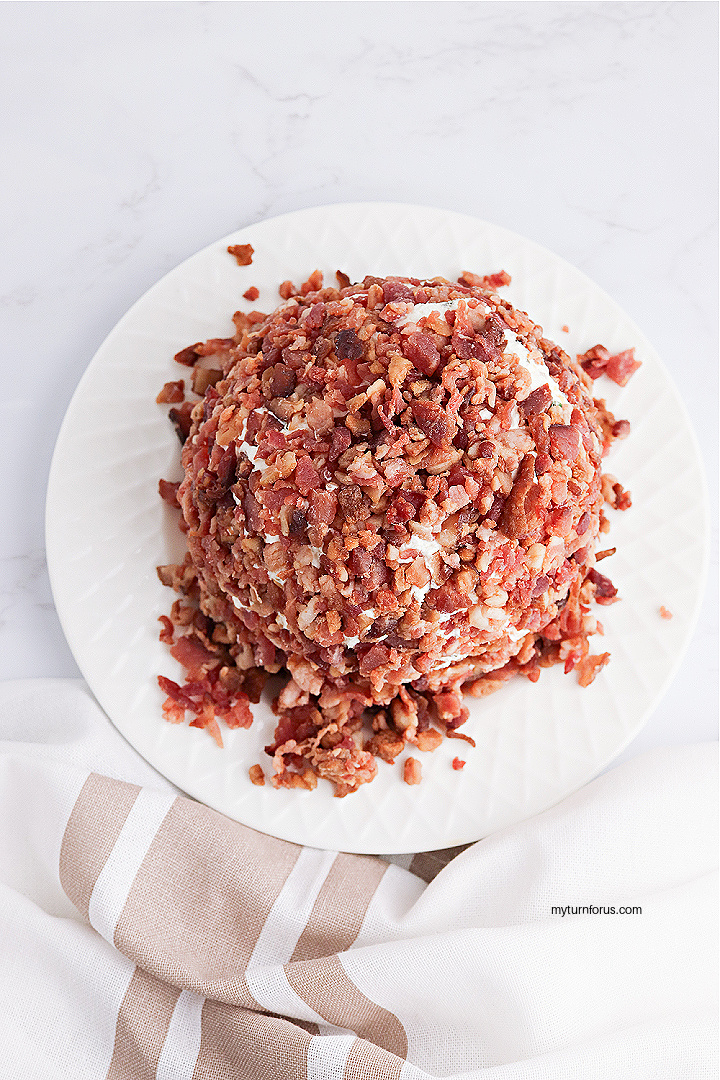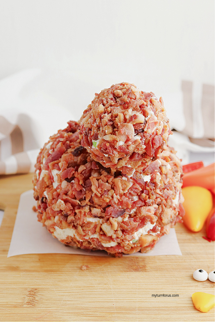 - When you are ready to serve this turkey cheese ball appetizer, remove both cheese balls from your refrigerator. Spread the remaining bacon pieces on a plate and roll the larger ball in the bacon, completely coating the ball. Place the large ball on your serving tray and repeat the steps to coat the smaller ball with the chopped bacon.