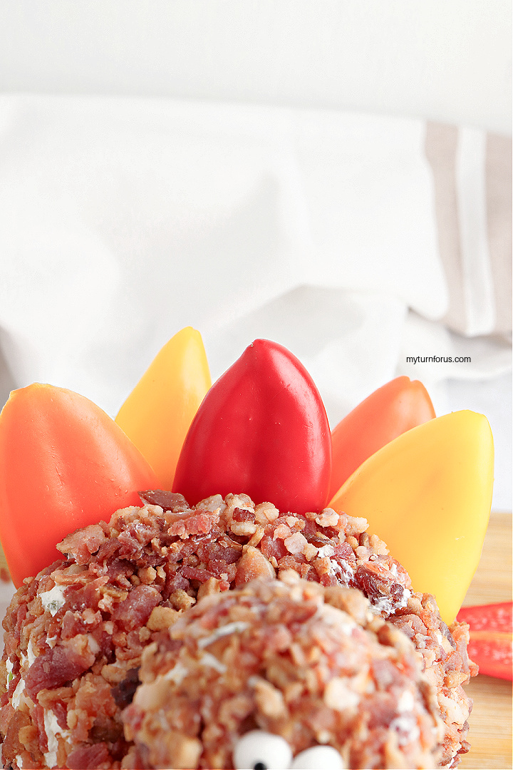 - Lightly press the cut mini peppers into the back of the large cheese ball to make the turkey’s feathers.