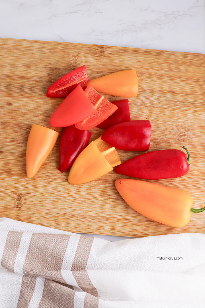 - While the cheese balls are chilling, wash the mini sweet peppers and slice off the tops. Cut them in half lengthwise and set aside.