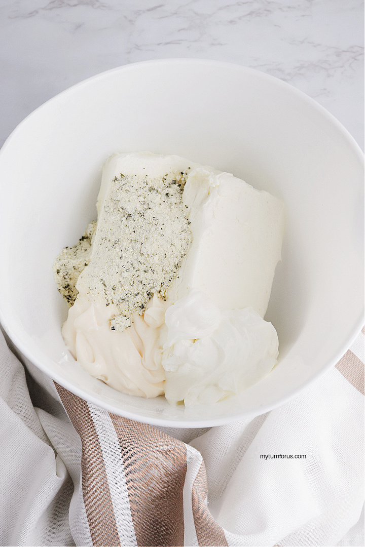- In a large mixing bowl add the cream cheese, sour cream, mayonnaise, and ranch seasoning and beat together until smooth.