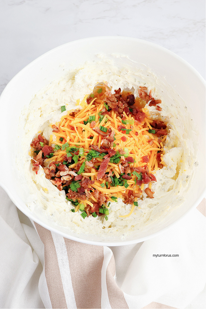 - Stir in the shredded cheese, chopped green onion, and half the bacon pieces and gently mix very well.