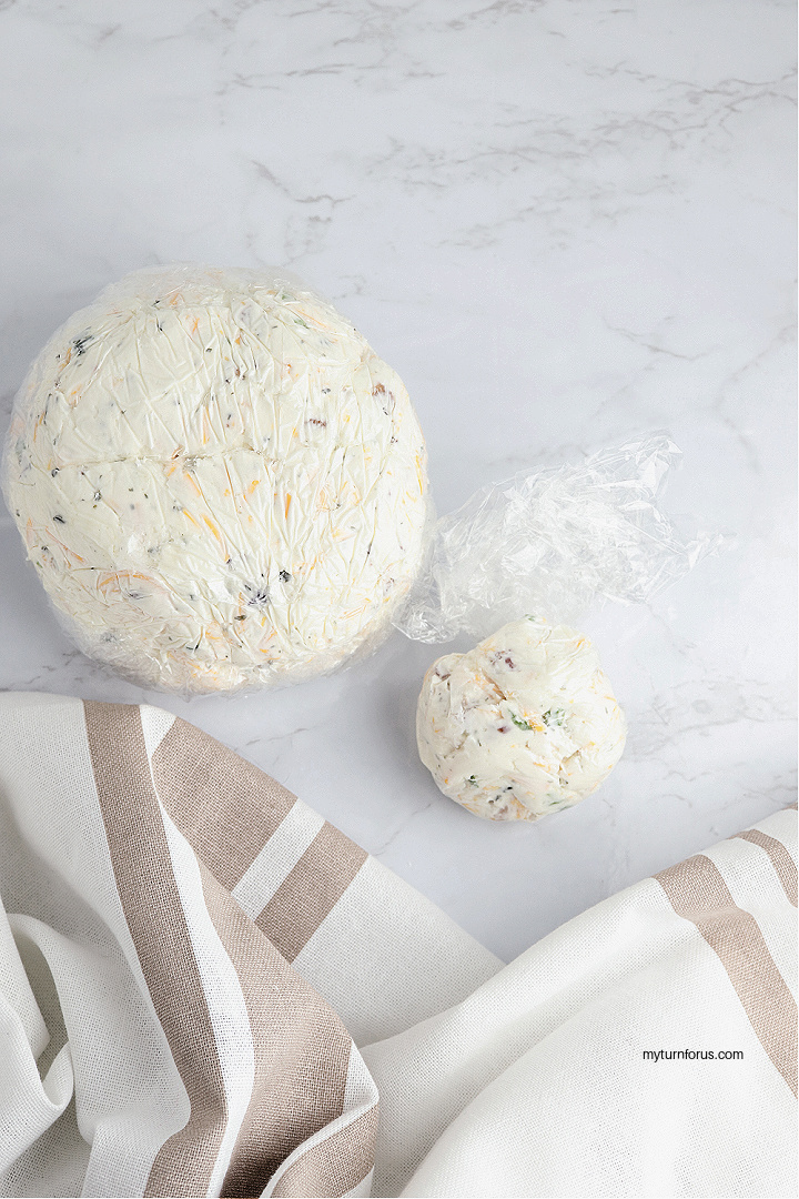 - Divide the dip mixture into one small ball and one large ball. Wrap each ball in plastic wrap and place in refrigerator for at least 4 hours