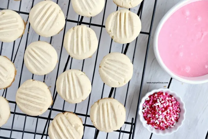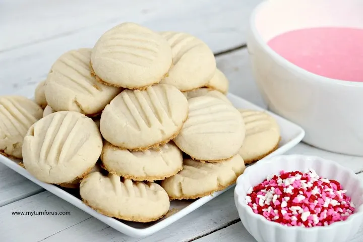 These Valentine Sugar Cookies made with powdered sugar are called melt away cookies. Valentine meltaway cookies are our favorite cookie recipes from scratch.