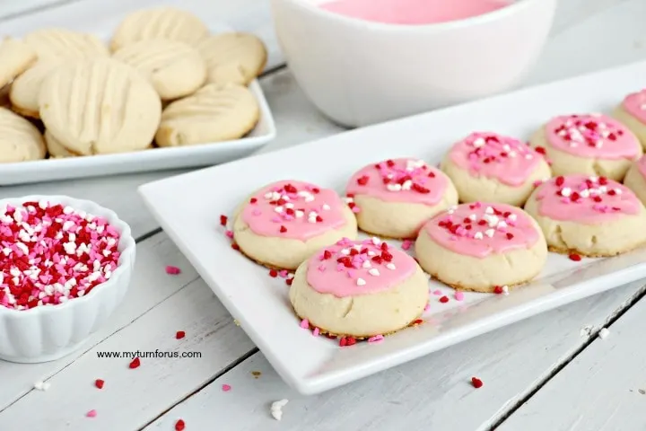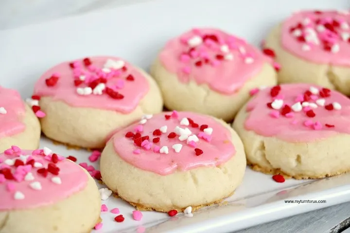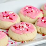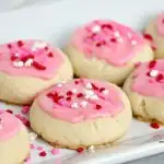 And these special little frosted Valentine’s Sugar Cookies are a great way to show your love. And this easy recipe for sugar cookies is our go-to recipe. Top it with a great pink frosting and sprinkles and you have the perfect little sugar cookie for valentine’s day. These cookies made with powdered sugar are a delicious meltaway cookie.