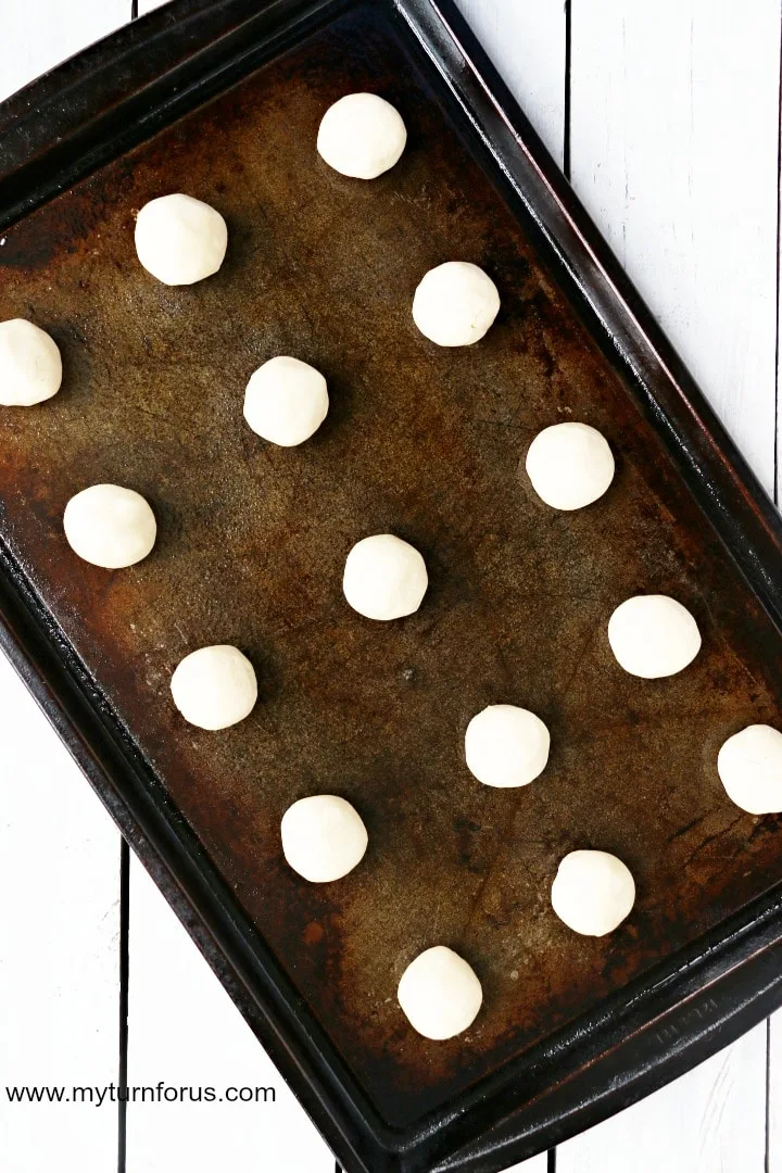 - Remove dough from fridge and Form dough into 1-inch balls and place them on a greased baking sheet.