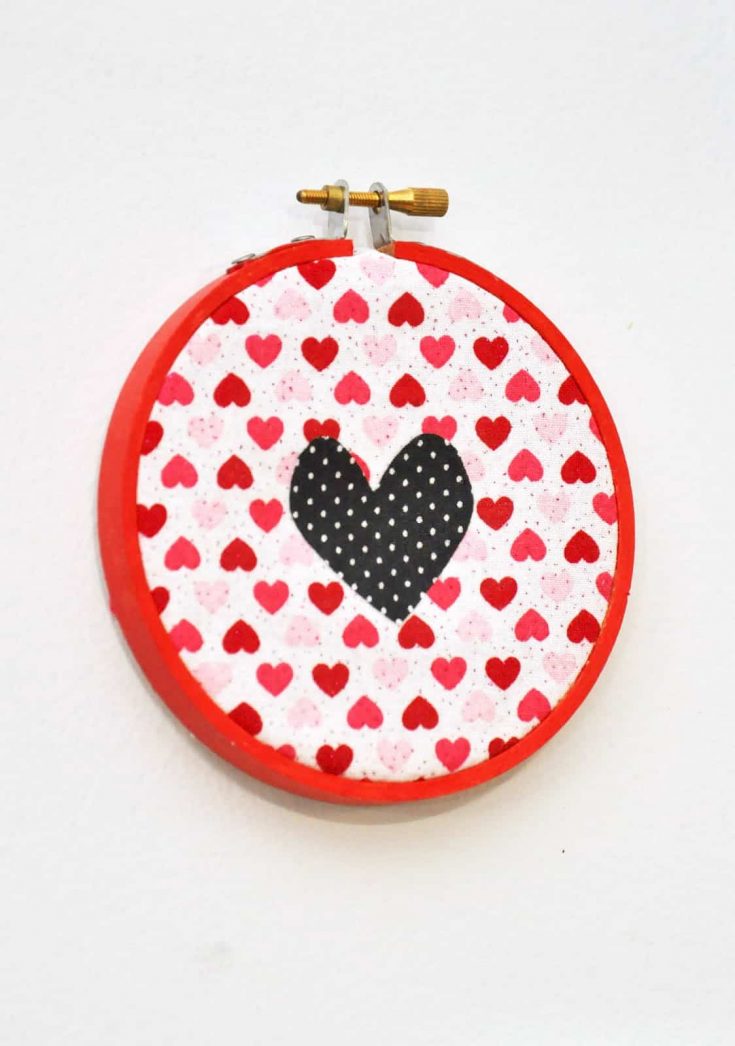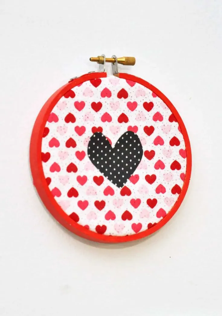 Cute little mixed fabric hoop with a simple heart of contrasting material. It's a Mod Podge creation!