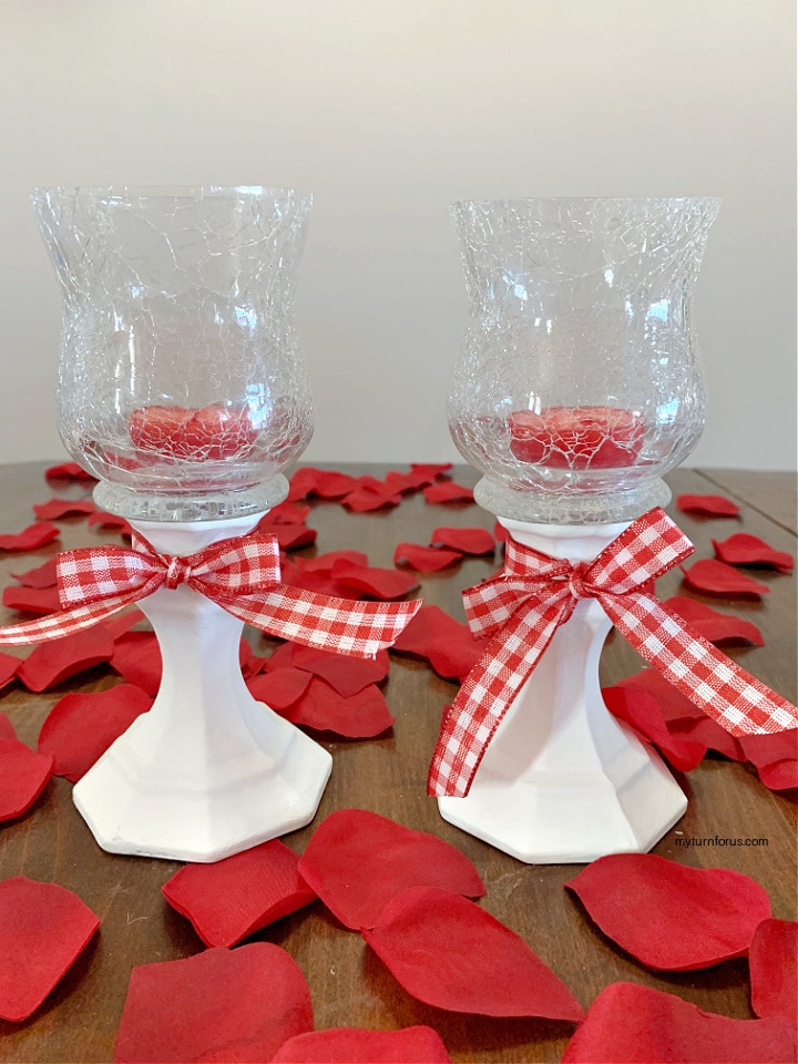 We used Dollar Tree items to make these pretty little Valentines Day Crackle glass Candle holders. So cute and very inexpens