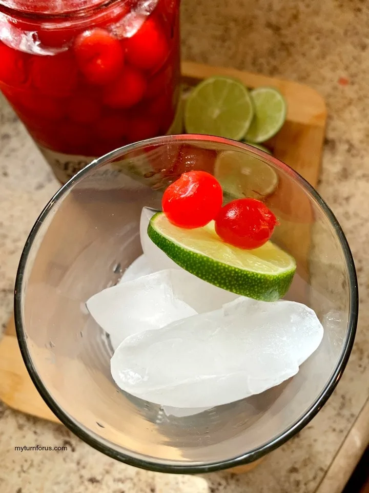 - Fill a tall glass with ice and add a slice of lime and two or three Moonshine cherries.