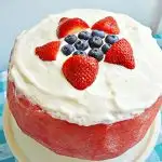 This Watermelon Star Cake is one of the easiest of our Summer Watermelon Desserts recipes. Only ingredients are Watermelon, Fresh fruit and whipped topping.