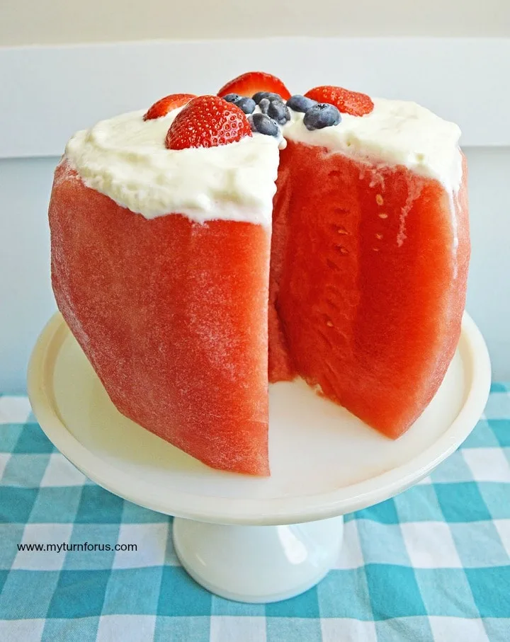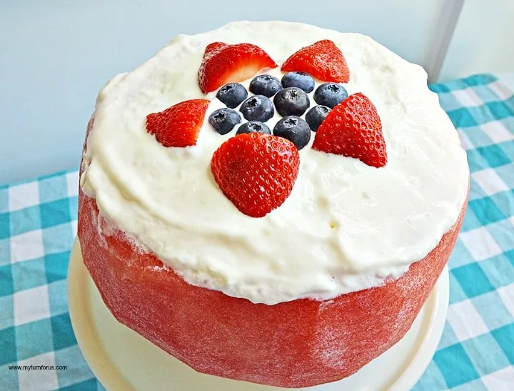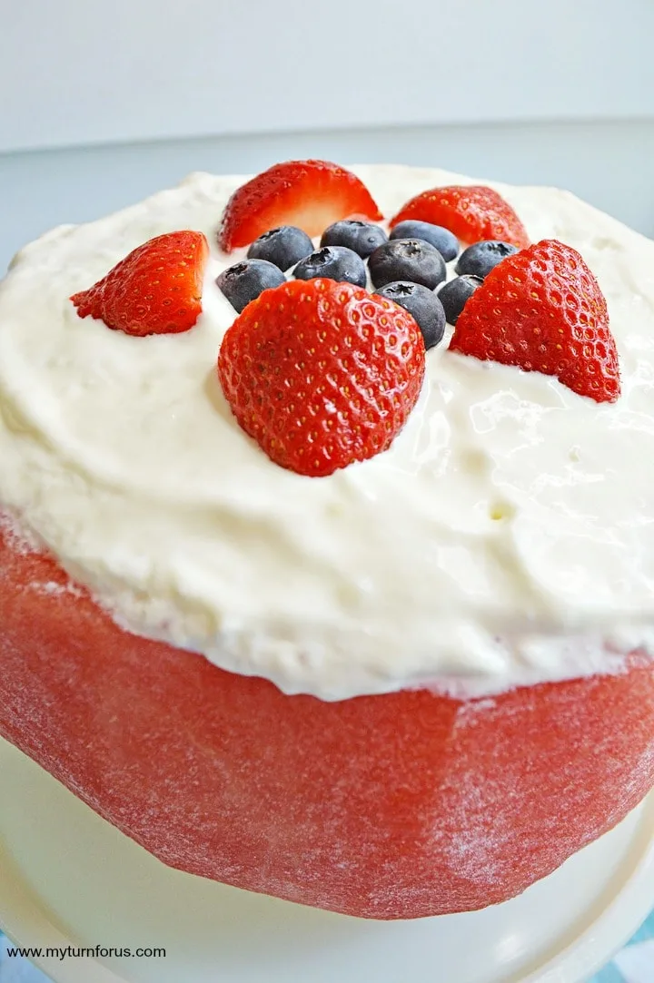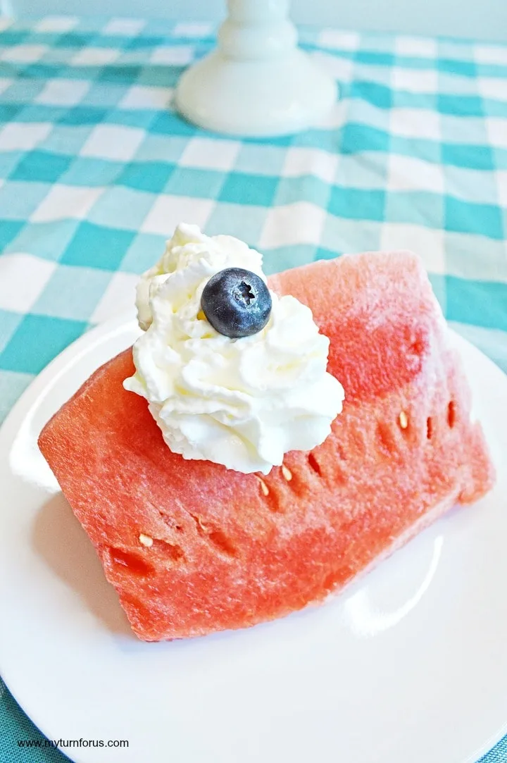 Serve each slice of this watermelon cake with additional whipped topping and blueberries or strawberries.   And you can use store-bought whipped topping or make it yourself easily at home using a whipped cream maker from Amazon.